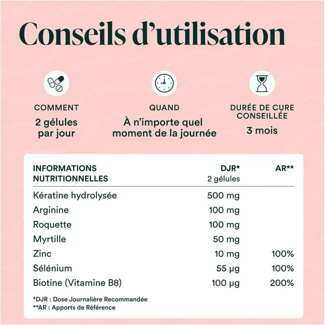 Ingrédients: Hydrolysat de kératine Cynatine® HNS, capsule végétale K-Caps® (agent d’enrobage : hydroxypropylméthylcellulose), amidon de riz*, arginine, extrait de feuille de roquette* (Eruca sativa Mill), extrait de fruit de myrtille des marais (Vaccinium uliginosum L.), bisglycinate de zinc, L-sélénométhionine, biotine (D-biotine). *Ingrédient issu de l'agriculture biologique.