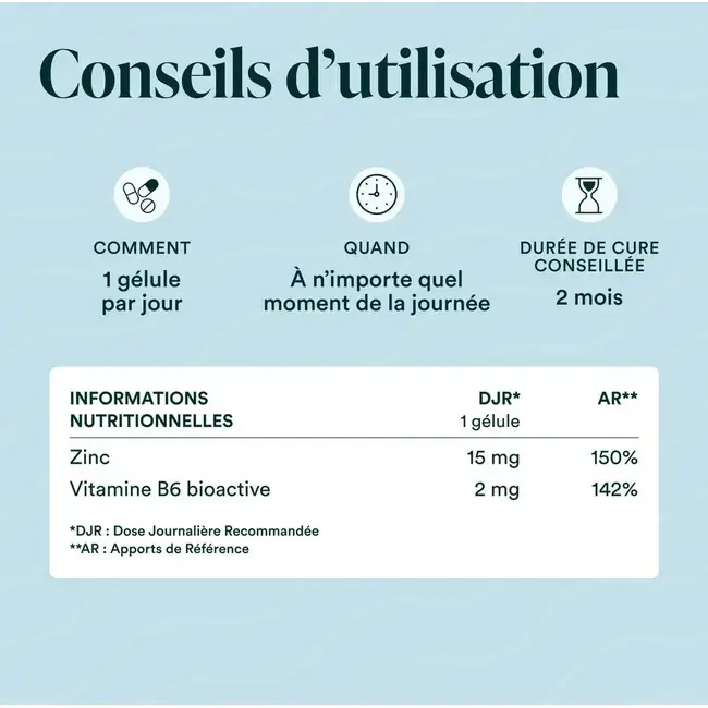 Ingrédients: Amidon de riz, capsule végétale K-Caps® (agent d’enrobage : hydroxypropylméthylcellulose), bisglycinate de zinc TRAACS®, vitamine B6 (pyridoxal-5-phosphate).